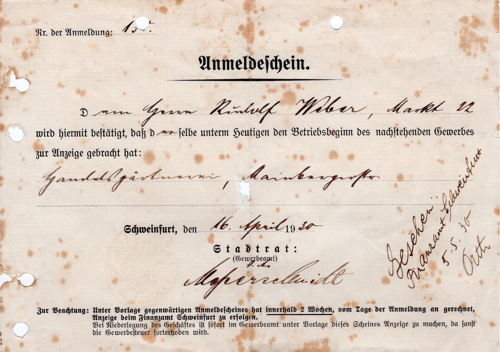 Am 16.04.1930 gründete Rudolf Weber zusammen mit seiner Frau Else eine Gemüse- und Zierpflanzengärtnerei, die zuerst in Schweinfurt, Mainberger Straße auf gepachtetem Land ansässig war.